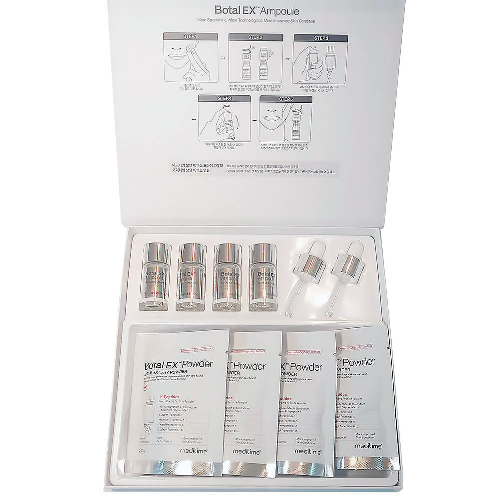 Основным компонентом ампул Botal EX™ Ampoule выступает ботулин — белок, вырабатываемый некоторыми видами бактерий. Ботулин насыщен специальными токсинами, блокирующими передачу нервных импульсов к лицевым мышцам, за счёт чего препятствуют их сокращению и оказывают действие миорелаксанта: существенно сокращается глубина мимических морщин в уголках губ, глаз и в зоне межбровья.